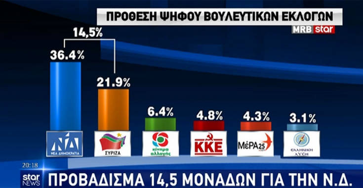 Στην πρόθεση ψήφου η ΝΔ προηγείται με 14,5% του ΣΥΡΙΖΑ. Συγκεκριμένα: