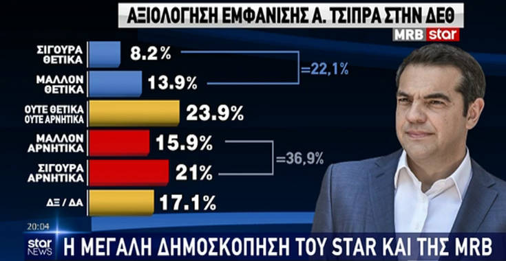 Το 22,1 % κρίνει θετικά (σίγουρα ή μάλλον) την εμφάνιση του πρωθυπουργού στη ΔΕΘ έναντι 36,9% που την κρίνει αρνητικά (σίγουρα ή μάλλον).
