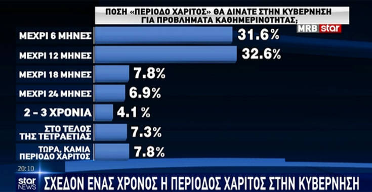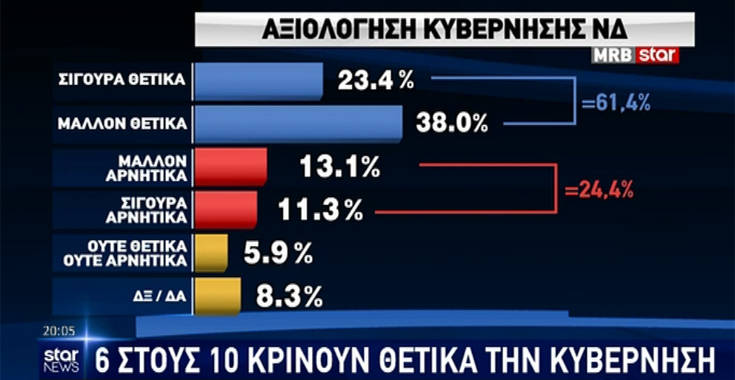 Έξι στους δέκα πολίτες κρίνουν θετικά το έργο της κυβέρνησης. Συγκεκριμένα 61,4% θετικά, 61,4 θετικά, 24,4% αρνητικά,5,9% ούτε το ένα ούτε το άλλο