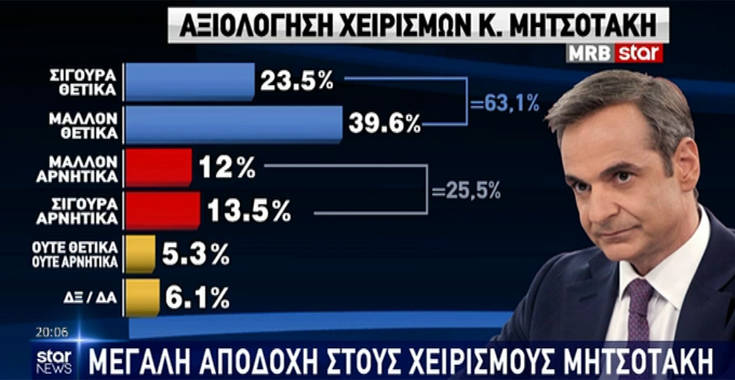 Στο πώς αξιολογούν τους χειρισμούς του πρωθυπουργού το 63,1% απαντάει θετικά. Το 25,5% αρνητικά