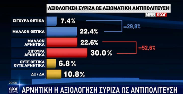 Στο ερώτημα πώς κρίνουν τον ΣΥΡΙΖΑ ως αντιπολίτευση το 23,8% απάντησε θετικά, 52.6 αρνητικά και 6,8 ούτε το ένα ούτε το άλλο.