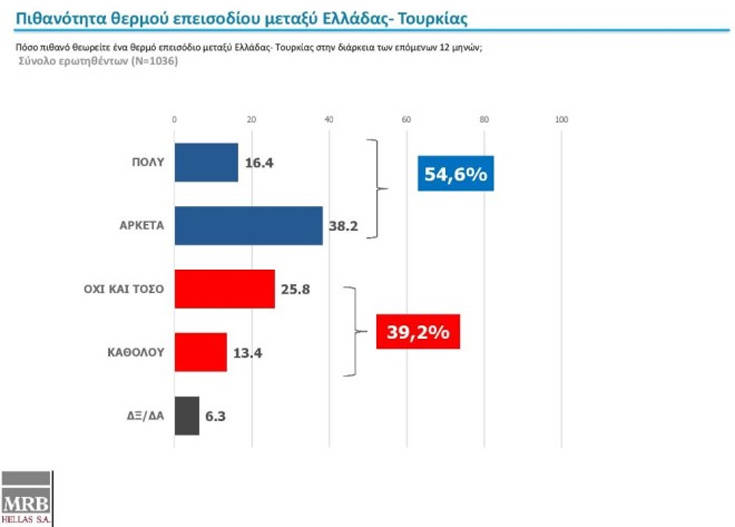 Στη δημοσκόπηση επίσης το 54,9% θεωρεί «πολύ» ή «αρκετά» πιθανό ένα θερμό επεισόδιο με την Τουρκία, ενώ το 42, 6% θεωρεί πιο ενδεδειγμένη λύση την προσφυγή στο Διεθνές Δικαστήριο της Χάγης για τις ελληνοτουρκικές διαφορές έναντι 28,8% που προτιμά τον απευθείας διάλογο μεταξύ των δύο χωρών, ενώ το 21,3% απαντά «καμιά από τις παραπάνω λύσεις».