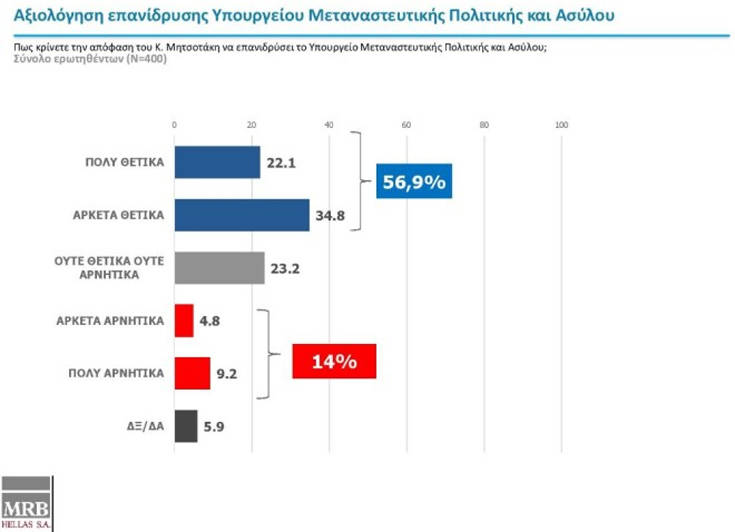 Επιπλέον υπήρξε και το ερώτημα για το πως κρίνετε την απόφαση του κ. Μητσοτάκη για την επανίδρυση του υπουργείου Μεταναστευτικής Πολιτικής και Ασύλου. Το 56,9% είδε θετικά την κίνηση του πρωθυπουργού, με το 14% να απαντάει αρνητικά.