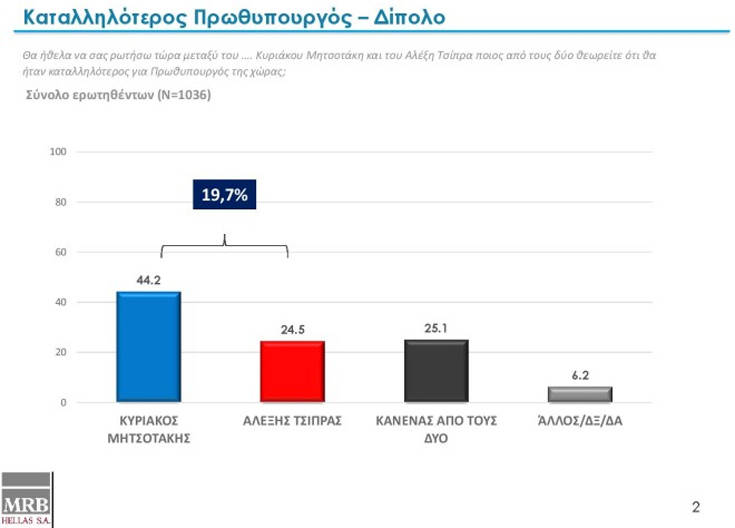 Στην ίδια δημοσκόπηση στο ερώτημα για το ποιος είναι καταλληλότερος πρωθυπουργός προηγείται ο Κυριάκος Μητσοτάκης του Αλέξη Τσίπρα με διαφορά 19,7% (44,2% έναντι 24,5%).