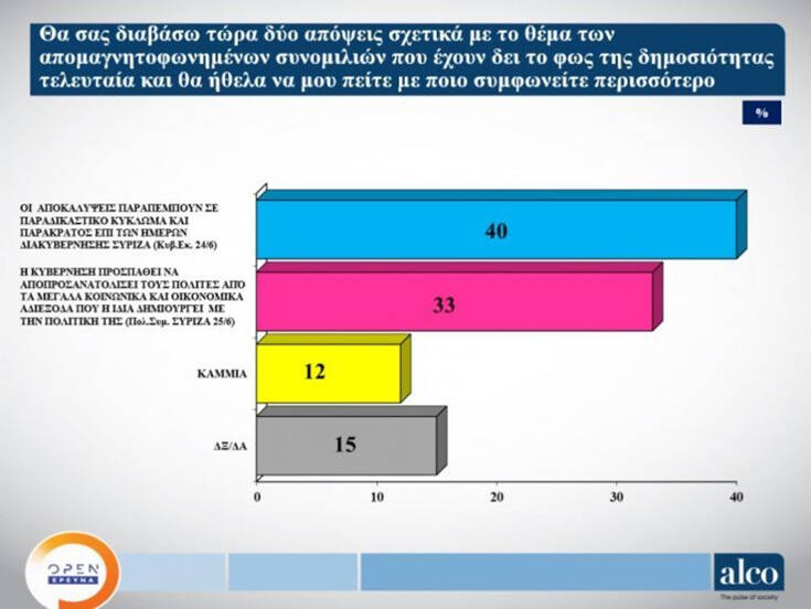 Μεταξύ των ερωτήσεων υπήρξε και το θέμα με τις απομαγνητοφωνημένες συνομιλίες. Το 40% των ερωτηθέντων πιστεύει ότι «οι αποκαλύψεις παραπέμπουν σε παραδικαστικό κύκλωμα και παρακράτος επί των ημερών διακυβέρνησης ΣΥΡΙΖΑ».