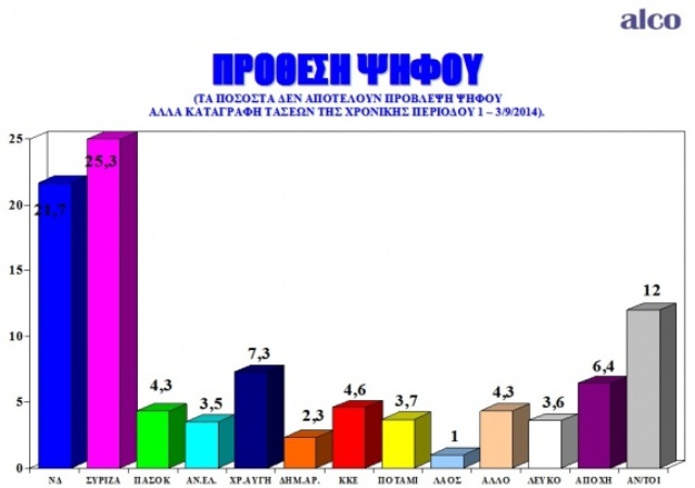 Με 3,6 % προηγείται ο ΣΥΡΙΖΑ της ΝΔ στη δημοσκόπηση της εταιρείας ALCO για την εφημερίδα «Το Ποντίκι» που κυκλοφορεί αύριο, Πέμπτη .