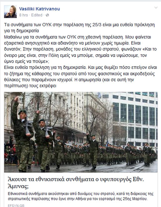«Tα συνθήματα των ΟΥΚ στην παρέλαση της 25/3 είναι μια ευθεία πρόκληση για τη δημοκρατία. Μαθαίνω για τα συνθήματα των ΟΥΚ στη χθεσινή παρέλαση. Μου φαίνεται εξαιρετικά ανησυχητικό και αδιανόητο να μείνουν χωρίς τιμωρία. Είναι δυνατόν; Στην παρέλαση, μονάδες του ελληνικού στρατού, φωνάζουν «Και το όνειρο μας είναι, στην Πόλη εμείς να μπούμε, σημαία να υψώσουμε, τον ύμνο εμείς να πούμε»; Είναι ευθεία πρόκληση για τη δημοκρατία. Και μας θυμίζει πόσο επείγον είναι το ζήτημα της κάθαρσης του στρατού από τους φασιστικούς και ακροδεξιούς θύλακες που παραμένουν ισχυροί. Η ατιμωρησία (και σε αυτή την περίπτωση) τους εκτρέφει», έγραψε η κ. Κατριβάνου στον λογαριασμό της στο Facebook.