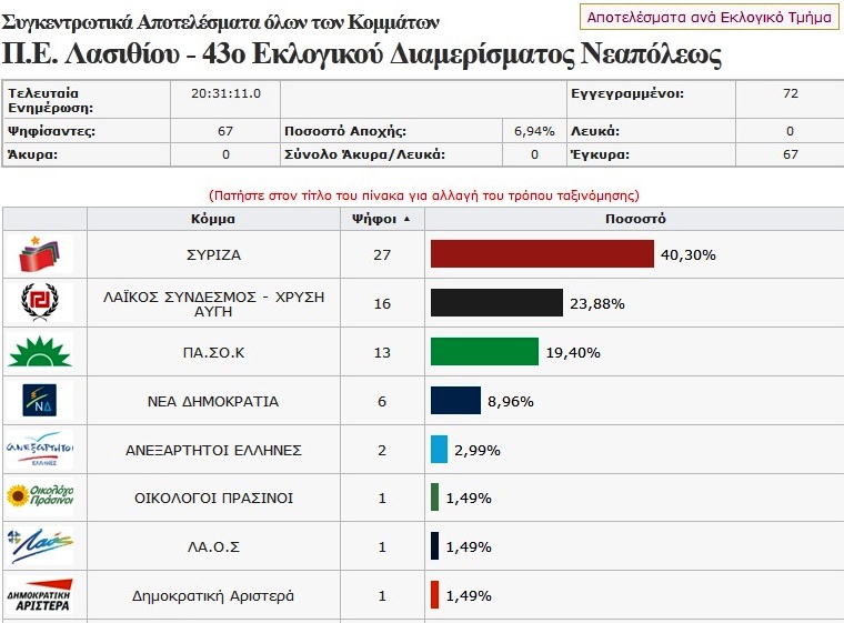 ο ίδιο εκλογικό τμήμα στις εκλογές της 6ης Μαίου, τα αποτελέσματα ήταν :