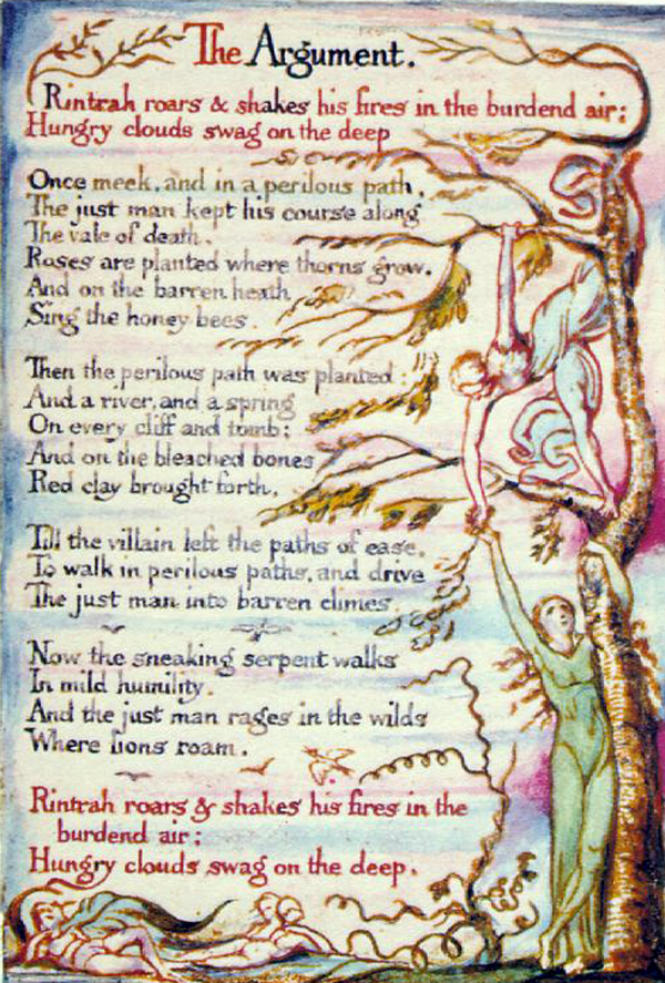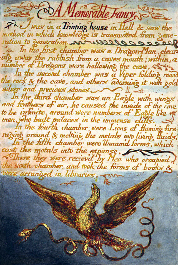 Την επόμενη χρονιά, ο Μπλέικ συλλαμβάνει σε ένα όραμα μια νέα μέθοδο τυπώματος των βιβλίων του, την οποία ονομάζει «πεφωτισμένη εκτύπωση», την οποία θα χρησιμοποιεί πλέον σε όλα του τα έργα από τη στιγμή που την επινόησε: καθένα από τα «φωτισμένα» βιβλία του αποτελούσε ένα αυτόνομο έργο τέχνης! Με τη νέα τεχνική στο πλευρό του, ο καλλιτέχνης αναπτύσσει το ιδιαίτερο ύφος που θα τον κάνει αργότερα σπουδαίο, επιτρέποντάς του να έχει τον πλήρη έλεγχο σε κάθε βήμα της τέχνης του.
