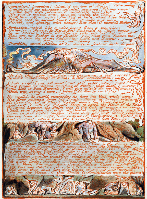 Παρά το σημαντικό του έργο και τις μνημειώδεις εικονογραφήσεις τόσο στα δικά του ποιήματα όσο και σε αναγνωρισμένους ποιητές της εποχής (Μίλτον, Μπλερ κ.ά.), οι κριτικοί συνέχισαν να μην εκτιμούν τον Μπλέικ. Το 1804, ο ποιητής άρχισε να γράφει και να εικονογραφεί την περίφημη και προφητική «Ιερουσαλήμ» (1804-20), το πλέον φιλόδοξο έργο του, που έμελλε να είναι και το τελευταίο του.