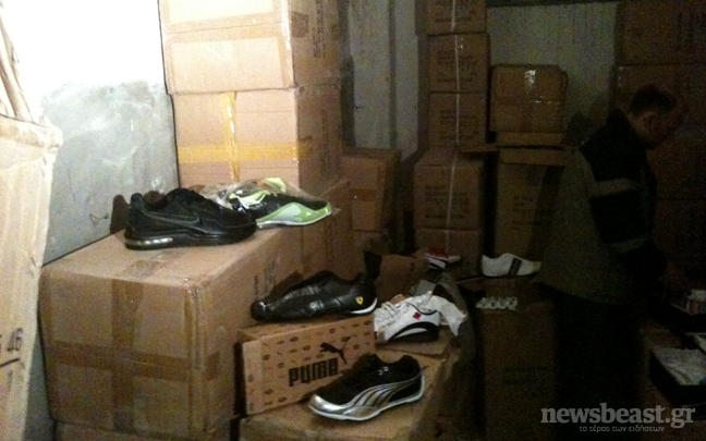 Χιλιάδες αθλητικά παπούτσια βρέθηκαν σε κρύπτη μέσα σε μια αποθήκη που οι κάτοικοι του κέντρου της Αθήνας, στην οδό Αισχύλου και Ευρυπίδου, γνώριζαν ότι λειτουργούσε σαν ψιλικατζίδικο.