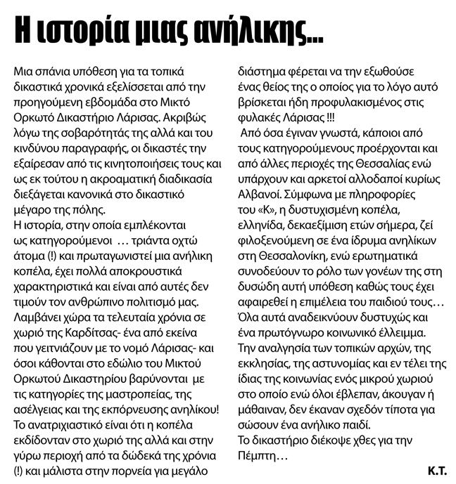 Η ιστορία σχετίζεται με το δράμα μίας ανήλικης Ελληνίδας σε χωριό της Καρδίτσας η οποία οδηγήθηκε στην πορνεία από τα 12 της χρόνια. Οι εμπλεκόμενοι που κάθονται στο εδώλιο του Μικτού Ορκωτού Δικαστηρίου Λάρισας είναι… 38 άτομα και βαρύνονται με τις κατηγορίες της μαστροπείας, της ασέλγειας και της εκπόρνευσης ανηλίκου.