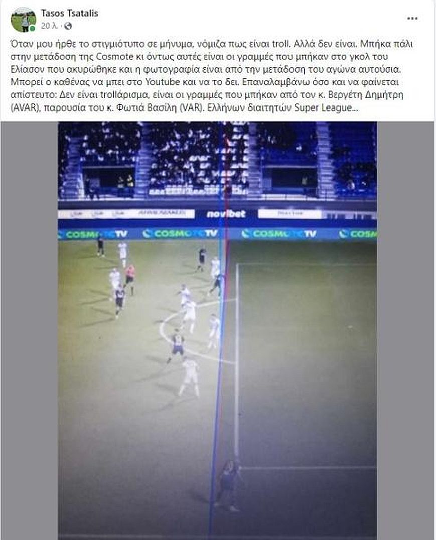 «Όταν μου ήρθε το στιγμιότυπο σε μήνυμα, νόμιζα πως είναι troll. Αλλά δεν είναι. Μπήκα πάλι στην μετάδοση της Cosmote κι όντως αυτές είναι οι γραμμές που μπήκαν στο γκολ του Ελίασον που ακυρώθηκε και η φωτογραφία είναι από την μετάδοση του αγώνα αυτούσια. Μπορεί ο καθένας να μπει στο Youtube και να το δει. Επαναλαμβάνω όσο και να φαίνεται απίστευτο: Δεν είναι trollάρισμα, είναι οι γραμμές που μπήκαν από τον κ. Βεργέτη Δημήτρη (AVAR), παρουσία του κ. Φωτιά Βασίλη (VAR). Ελλήνων διαιτητών Super League…», ανέφερε χαρακτηριστικά.
