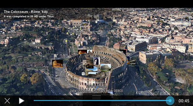 Επίσης, η Google μας είχε παρουσιάσει την δυνατότητα για τρισδιάστατη εναέρια πλοήγηση στις περιοχές αυτές. Πρόκειται για μικρά animated βίντεο-κλιπ, που σας ξεναγούν σε αυτές τις περιοχές, ενώ στο τέλος κάθε παρουσίασης, σας παρουσιάζει μία συλλογή από πανοραμικές εικόνες του Panorimio, με στόχο την λεπτομερέστερη απόδοση των ιδιομορφιών της εκάστοτε περιοχής.