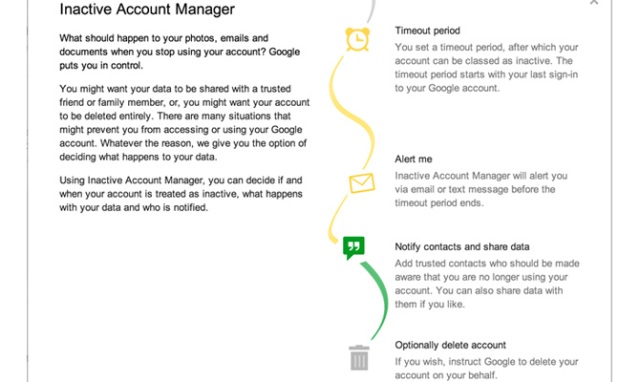 Όσο μακάβριο και αν ακούγεται, το θέμα της διαχείρισης των προσωπικών ψηφιακών δεδομένων, δεν παύει να είναι υπαρκτό. Έτσι, η υπηρεσία «Inactive Account Manager» δίνει τη δυνατότητα στο χρήστη να επιλέξει την αυτόματη διαγραφή των δεδομένων του έπειτα από κάποιο διάστημα μετά το θάνατό του, ή την κληροδότησή τους σε άλλους χρήστες.