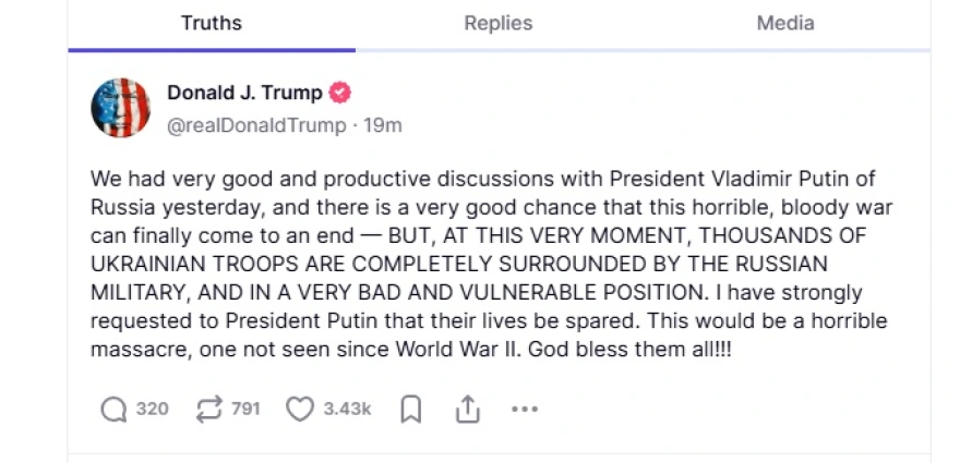«Είχαμε πολύ καλές και παραγωγικές συζητήσεις με τον πρόεδρο της Ρωσίας Βλαντιμίρ Πούτιν χθες, και υπάρχει μια πολύ καλή πιθανότητα αυτός ο φρικτός, αιματηρός πόλεμος να τελειώσει επιτέλους. Αλλά αυτή τη στιγμή, χιλιάδες ουκρανοί στρατιώτες είναι τελείως περικυκλωμένοι από τον ρωσικό στρατό, σε πολύ άσχημη και ευπαθή θέση. Ζήτησα έντονα από τον πρόεδρο Πούτιν να τους χαρίσει τη ζωή και να μην τους σκοτώσει. Αυτό θα ήταν μια φρικτή σφαγή, που δεν έχει ξαναγίνει από τον Β’ Παγκόσμιο Πόλεμο. Ο Θεός να τους ευλογεί όλους!».