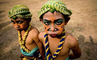 Δύο νεαρά αγόρια με το παραδοσιακό μέικ-απ του Φεστιβάλ Borobudur, στην Ιάβα της Ινδονησίας