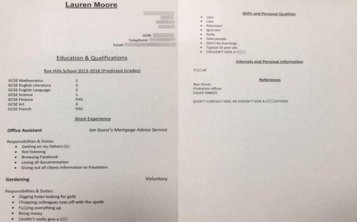Στην περίπτωση της νεαρής Λόρεν Μουρ από το Ρέντκαρ του Μίντλεσμπρο, τα πράγματα δεν είναι ακριβώς έτσι. Ανέθεσε στον πατέρα της να της φτιάξει το βιογραφικό της σημείωμα ενόψει των εξετάσεων για την εισαγωγή στα ανώτατα εκπαιδευτικά ιδρύματα και το αποτέλεσμα ήταν ένα πρωτότυπο βιογραφικό, αστείο, αρκετά ειλικρινές και γεμάτο βωμολοχίες.
