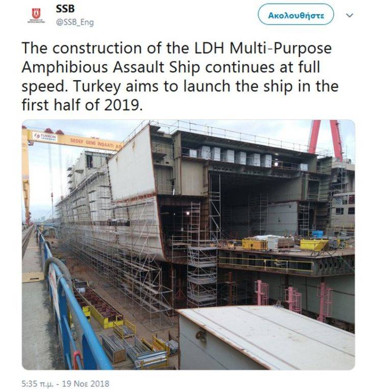 Με γρήγορους ρυθμούς συνεχίζεται η κατασκευή του ελικοπτεροφόρου και εν δυνάμει μίνι αεροπλανοφόρου της Τουρκίας, που θα φέρει το όνομα «Ανατολία», σύμφωνα με ανάρτηση της Γραμματείας Αμυντικής Βιομηχανίας της γειτονικής χώρας στο Twitter.