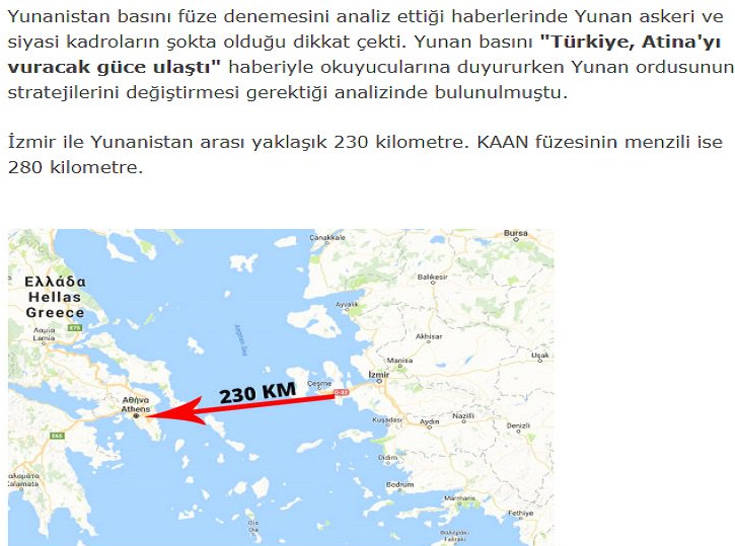 Η τουρκική εφημερίδα γράφει χαρακτηριστικά πως στα ελληνικά ΜΜΕ αναφέρουν: «Η Τουρκία έφτασε στο επίπεδο που μπορεί να χτυπήσει την Αθήνα».
