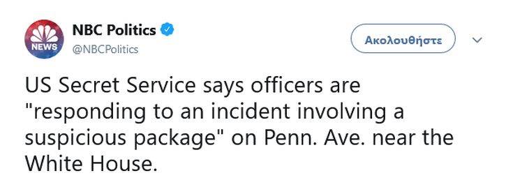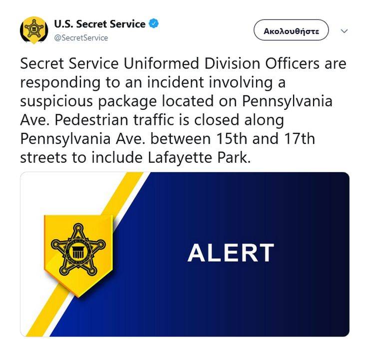 Συναγερμός σήμανε στην Ουάσινγκτον, καθώς ένα ύποπτο δέμα βρέθηκε στη λεωφόρο Πενσιλβάνια, κοντά στον Λευκό Οίκο, σύμφωνα με τις μυστικές υπηρεσίες των ΗΠΑ.