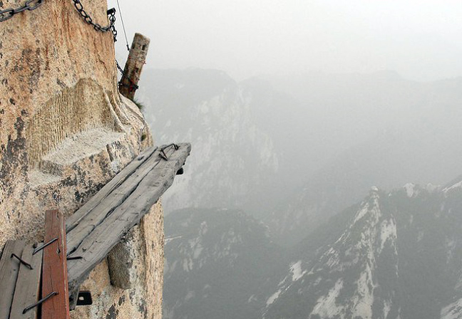 Το βουνό Huashan σκαρφαλώνει σε ύψος 2.100 μέτρων πριν χαθεί στα σύννεφα. Οι απίστευτα απόκρημνες πλαγιές του και τα κατσάβραχα κάνουν την ορειβασία σχεδόν αδύνατη. Γι’ αυτό και υπάρχει το τρομακτικότατο αυτό μονοπάτι, που κατασκευάστηκε στα 1800, που μοιάζει βέβαια περισσότερο με εφιάλτη παρά με πραγματικότητα. Το ξεχαρβαλωμένο σύστημα των σανίδων πλάτους 60 εκατοστών τυλίγει το βουνό, επιτρέποντας στους τολμηρούς πεζοπόρους να το διαβούν, την ώρα που είναι δεμένοι με αλυσίδες προχείρως προσαρμοσμένες στα μαλακά ιζηματογενή πετρώματα του βουνού, με τον γκρεμό των 900 μέτρων να καραδοκεί σε κάθε λάθος. Η διαβόητη φήμη του βουνού σε ανθρώπινες ζωές του έχει κολλήσει το παρατσούκλι «το βουνό του θανάτου»…