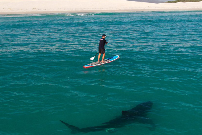 Το paddle boarding, κωπηλασία δηλαδή πάνω σε ιστιοσανίδα, είναι πλέον ένα δημοφιλές σπορ παγκοσμίως, το οποίο δεν κατατάσσεται φυσικά στα extreme sports. Ο διψασμένος για αδρεναλίνη ωστόσο μπορεί να το κάνει σαφώς πιο ακραίο, μετατρέποντάς το σε περιπέτεια για γερά νεύρα: εξασκεί το χαλαρό σπορ συνοδεία του μεγάλου λευκού και το πράγμα παίρνει άλλη τροπή!
