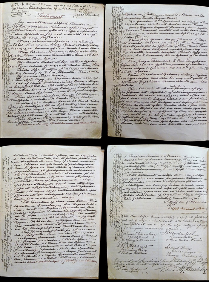 «Ολόκληρη η ρευστοποιήσιμη περιουσία μου θα διαχειριστεί ως εξής: το κεφάλαιο θα επενδυθεί σε ασφαλείς τίτλους από τους εκτελεστές της διαθήκης μου. Οι τόκοι που θα προκύπτουν θα διανέμονται κάθε χρόνο με τη μορφή βραβείων σε εκείνους που τον προηγούμενο χρόνο θα έχουν προσφέρει κάτι σημαντικό στην ανθρωπότητα. Οι προαναφερόμενοι τόκοι θα μοιράζονται σε πέντε ίσα μέρη: ένα για τον άνθρωπο που θα έχει κάνει τη σημαντικότερη ανακάλυψη ή εφεύρεση στον τομέα της Φυσικής, ένα στον τομέα της Χημείας, ένα στο χώρο της Ιατρικής και της Φυσιολογίας, ένα στον χώρο της Λογοτεχνίας και ένα ακόμη στον άνθρωπο που θα προσφέρει το σημαντικότερο έργο για την αδελφοποίηση των εθνών, την κατάργηση ή τη μείωση των όπλων και των στρατών και την προώθηση συνεδρίων για την ειρήνη. Τα βραβεία για τη Φυσική και τη Χημεία θα απονέμονται από τη Σουηδική Ακαδημία Επιστημών, εκείνο της Ιατρικής και Φυσιολογίας από το Ινστιτούτο Caroline της Στοκχόλμης, της Λογοτεχνίας από την Ακαδημία της Στοκχόλμης και εκείνο για τους “πρωταθλητές της ειρήνης” από μια πενταμελή επιτροπή που θα εκλέγεται από το νορβηγικό κοινοβούλιο.