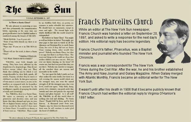 Αν κάθε παιδί πιστεύει στα Χριστούγεννα, πρέπει να ευχαριστεί γι’ αυτό τόσο τους γονείς του όσο και τον δαιμόνιο αμερικανό εκδότη! Κι αυτό γιατί όταν η 8χρονη Virginia O’Hanlon ρώτησε το 1897 με επιστολή της την εφημερίδα «New York Sun» αν υπήρχε πράγματι ο Άγιος Βασίλης, ήταν ο εκδότης Francis Church που της απάντησε με τρόπο που δεν χωρούσε αμφιβολία. Η μνημειώδης απάντησή του μέσα από τις στήλες της εφημερίδας «Ναι, Virginia, υπάρχει ο Άγιος Βασίλης» (δημοσιεύτηκε στις 21 Σεπτεμβρίου) έμελλε να γίνει ένα από τα πλέον πολυπαιγμένα editorial όλων των εποχών και να αφήσει το δικό του στίγμα στη χριστουγεννιάτικη επικράτεια! Παρά το γεγονός ότι δεν διευκρίνισε ποτέ αν ο Santa ήταν όντως υπαρκτό πρόσωπο που χαρίζει δώρα κάθε χρόνο στα παιδιά, απηύθυνε την ανοιχτή ερώτηση στους αναγνώστες (και τη Virginia φυσικά) αν θα μπορούσαν ποτέ να φανταστούν έναν κόσμο χωρίς τον Άγιο Βασίλη και τη μυθολογία των Χριστουγέννων, έναν κόσμο χωρίς φαντασία και καλοσύνη δηλαδή. Και κάτι ακόμα: το «Ναι, Virginia, υπάρχει ο Άγιος Βασίλης» έδωσε στους γονείς έναν κομψό τρόπο να συντηρούν την παιδική αθωότητα χωρίς να καταστρέφουν τη χριστουγεννιάτικη μαγεία από την ντελικάτη αυτή ερώτηση. Ο εκδότης μάλιστα δεν υπέγραψε ποτέ την εμβληματική απάντησή του στο κορίτσι, καθώς ήξερε προφανώς ότι το θέμα δεν αφορούσε αυτόν, αλλά ήταν κάτι σαφώς μεγαλύτερο και σπουδαιότερο…