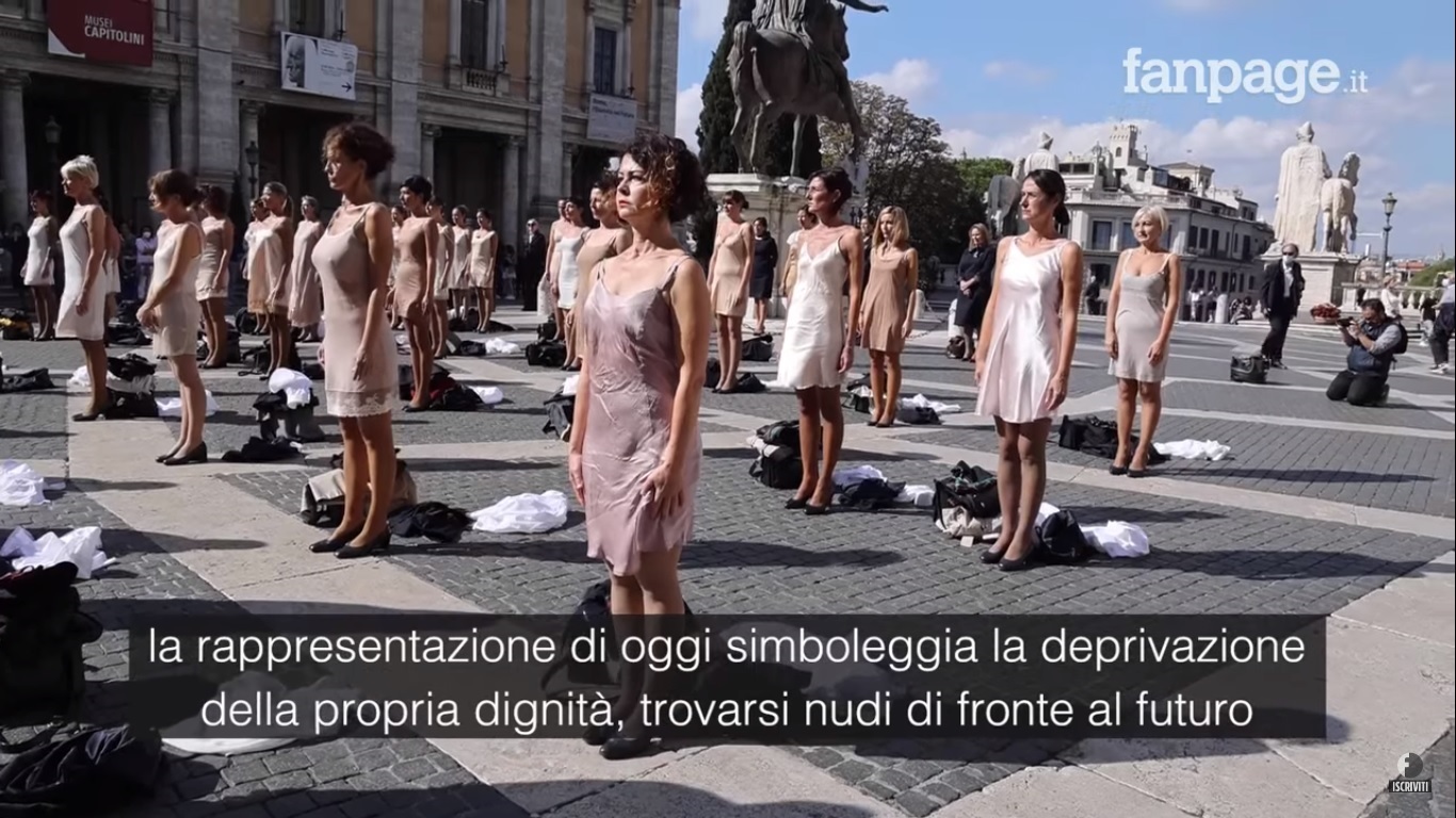 Στην αρχή ντυμένες, οι εργαζόμενες του πρώην εθνικού αερομεταφορέα της Ιταλίας γδύθηκαν αργά και αθόρυβα, ρίχνοντας τις στολές τους στο έδαφος και παρέμειναν με τα μισοφόρια στο κέντρο της πλατείας για να εκφράσουν τον «πόνο τους» μετά την πτώχευση της εταιρείας. Άφησαν τα υποδήματά τους εκεί και οι γυναίκες μετακινήθηκαν στη μία πλευρά της πλατείας.