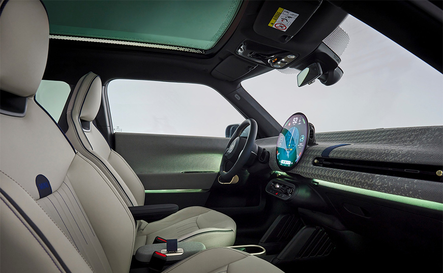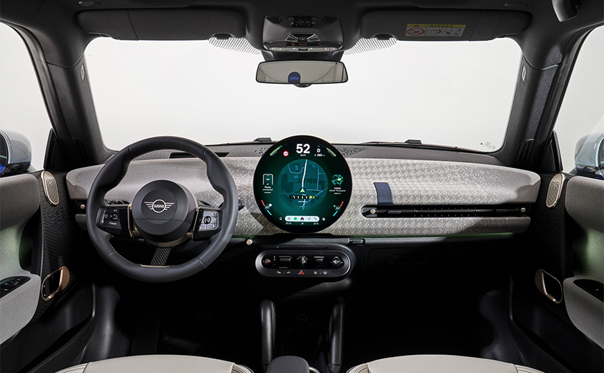 Στο εσωτερικό, ο σχεδιασμός του εμπρός τμήματος θυμίζει τη μινιμαλιστική αισθητική του κλασικού Mini, με το στρογγυλό ταμπλό οργάνων στο κέντρο και τη χαρακτηριστική μπάρα διακοπτών από κάτω. Το νέο εσωτερικό αρκείται σε μικρότερο αριθμό εξαρτημάτων, τα οποία είναι έξυπνα σχεδιασμένα και κατασκευασμένα με υψηλά πρότυπα. Πίσω από το τιμόνι, το προαιρετικό head-up display διασφαλίζει ότι όλο το σχετικό περιεχόμενο θα προβάλλεται στο οπτικό πεδίο του οδηγού. Ως αποτέλεσμα, το ταμπλό στην πλευρά του οδηγού δεν απαιτεί την παρουσία πρόσθετης οθόνης, με αποτέλεσμα η ορατότητα προς τα εμπρός να είναι απρόσκοπτη.