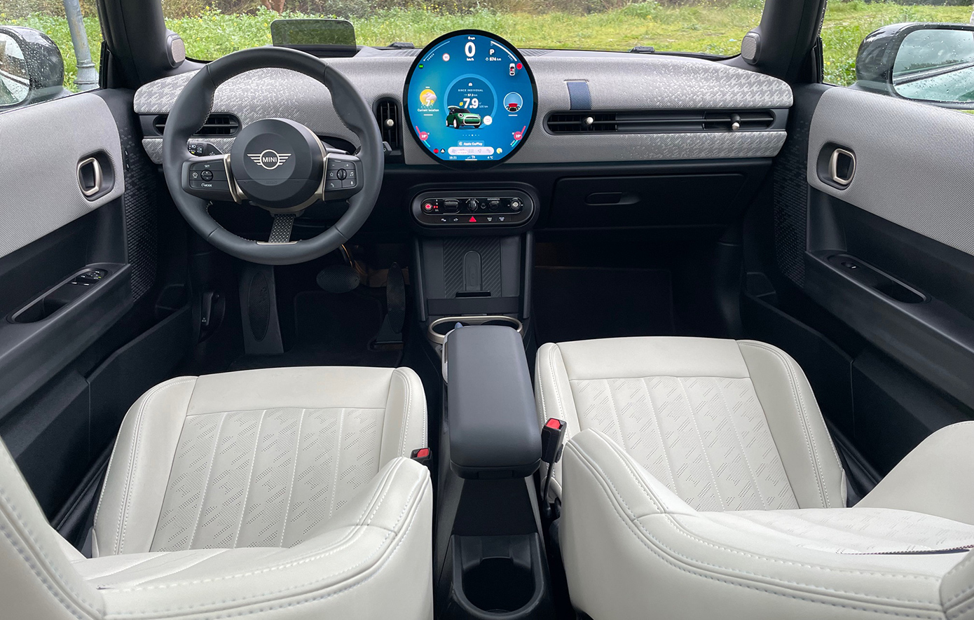 Στο ευχάριστο και πολυτελές εσωτερικό, το στρογγυλό «πολυόργανο» διαμέτρου 240 χλστ στη μέση του ταμπλό, διατηρεί την παράδοση και φιλοξενεί όλη την σύγχρονη τεχνολογία συνδεσιμότητας (Operating System 9) με αντικείμενο την ενημέρωση, την ψυχαγωγία και την ασφάλεια. Το σήμα κατατεθέν του εσωτερικού, συνοδεύεται από ρετρό φυσικούς διακόπτες, πολύ πιο λειτουργικούς από τις διαδικασίες αφής που επιτρέπει η οθόνη.