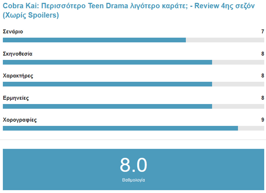 Η 4η σεζόν είχε μερικά πολύ δυνατά χαρτιά στα χέρια της αλλά δεν καταφέρνει να γίνει η καλύτερη σεζόν του Cobra Kai. Βασικός λόγος αυτού είναι το αχρειαστο εφηβικό δράμα αλλά και το πολύ μπρος πίσω στην συμμαχία LaRusso-Lawrence. Οι δύο χαρακτήρες έχουν προϊστορία χρόνων και οι ηθοποιοί φαίνεται πως έχουν μοναδικοί χημεία και καταφέρνουν να κρατήσουν την σειρά. Ωστόσο η 4η σεζόν ένιωσα πως λίγο τους αδίκησε. Η δυσκολία εύρεσης κοινού εδάφους είναι απολύτως λογική και αναμενόμενη, αρχικά είναι κάτι που σου τραβάει το ενδιαφέρον αλλά μετά από ένα σημείο και μερικές αποτυχημένες προσπάθειες αρχίζει να μοιάζει παιδιάστικο και να χάνει την αξία του.
