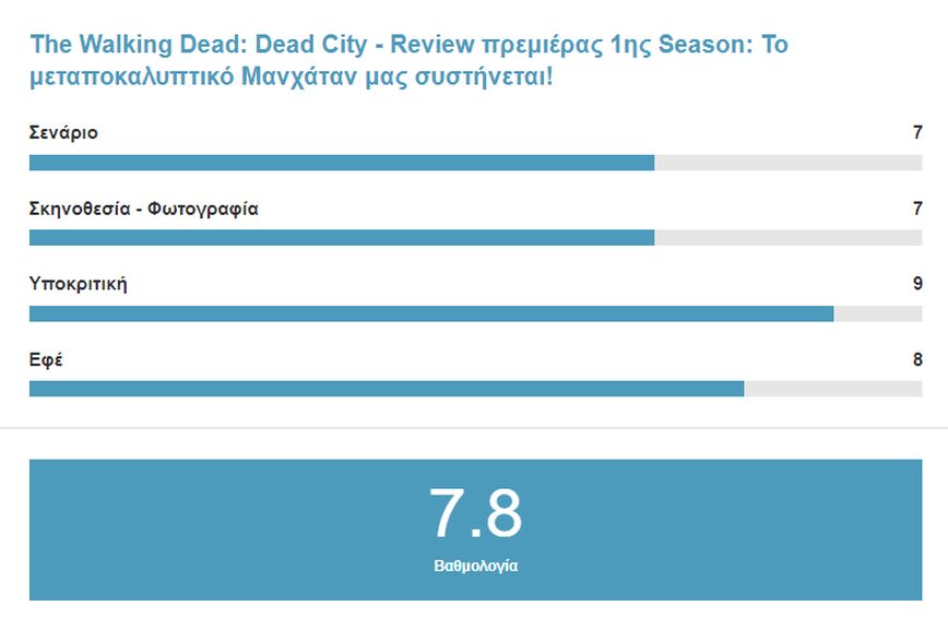 Είχα αγωνία να δω το πρώτο επεισόδιο και να ακούσω αυτή την μοναδική φωνή του Negan. Η γεύση που μου άφησε ήταν αυτή όμως της πικρίας. Ήθελα να πάρω λίγες παραπάνω πληροφορίες και λίγο μεγαλύτερο επεισόδιο γενικά σαν πρεμιέρα. Βέβαια σε βάζει αρκετά γρήγορα στο νόημα της σεζόν. Είχε δράση και κυρίως είχε εικόνες που μας έλειψαν. Πόλη… ζόμπι παντού… ξύλο… ανατριχίλα!