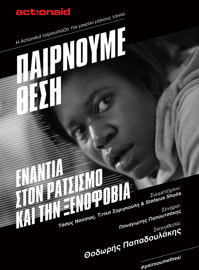 Μια ταινία μικρού μήκους που μας προτρέπει να σπάσουμε τη σιωπή και να υψώσουμε το ανάστημά μας ενάντια στο ρατσισμό και την ξενοφοβία που έχουν γιγαντωθεί στην Ελλάδα, δημοσιοποίησε σήμερα η ActionAid. Πρόκειται για το φιλμ «Παίρνουμε Θέση» του Θοδωρή Παπαδουλάκη, που μπορείτε να δείτε παρακάτω.