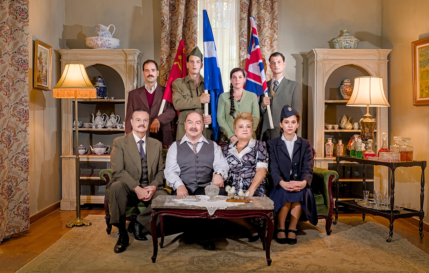 Στην παράσταση στο Μικρό Παλλάς, ο Σταμάτης Φασουλής ερμηνεύει τον κυρ-Παντελή και η Ελένη Καστάνη τη σύζυγό του, Αθηνά. Ο Απόστολος Καμιτσάκης είναι ο Σταύρος, ο δεξιός γιός και ο Γιώργος Βουρδαμής, είναι ο Κώστας, ο αριστερός γιός. Τον κυρ-Σωτήρη, τον φίλο του κυρ-Παντελή, ερμηνεύει ο Γιώργος Δεπάστας. Η Δέσποινα Πολυκανδρίτου ερμηνεύει την «υπηρέτρια» του σπιτιού, τη Φρόσω και τραγουδάει και τα τραγούδια της παράστασης. Τον πολιτοφύλακα και τον εθνοφύλακα ερμηνεύει, σαν τις δύο όψεις του ίδιου νομίσματος, ο Γιώργος Κορομπίλης. Το ίδιο συμβαίνει επίσης, με τη Φωφώ την ελασίτισσα και την Πιπίτσα την εθνικίστρια, που τις ερμηνεύει, η Μαρία Καραβά.
