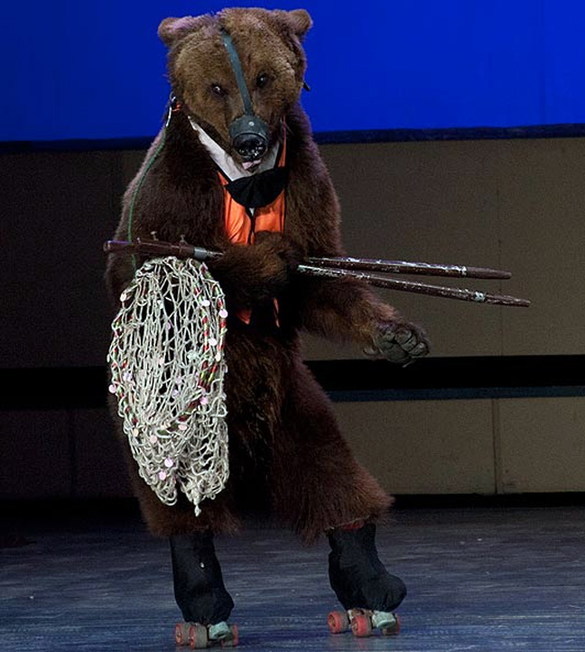 Αρκούδες- φορώντας φίμωτρα…- αναγκάζονται να περπατούν στα δύο πόδια ή να κάνουν πατινάζ δε τρεις παραστάσεις καθημερινά, προς τέρψιν του κοινού που αποτελείται κυρίως από στρατιώτες.