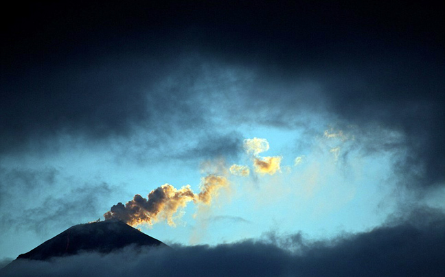 Έκρηξη του ηφαιστείου Klyuchevskoy στην Καμτσάτκα της Ρωσίας, υπό το πρώτο φως του πρωινού.