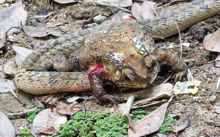 Το ερπετό χρησιμοποιεί τα δόντια του για «να ανοίξει διάπλατα την κοιλιά μεγάλων και δηλητηριωδών βατράχων και μετά εισάγει εντός της όλο το κεφάλι του ώστε να βγάλει έξω και να φάει τα όργανα ένα-ένα, όσο η λεία είναι ακόμα ζωντανή!».
