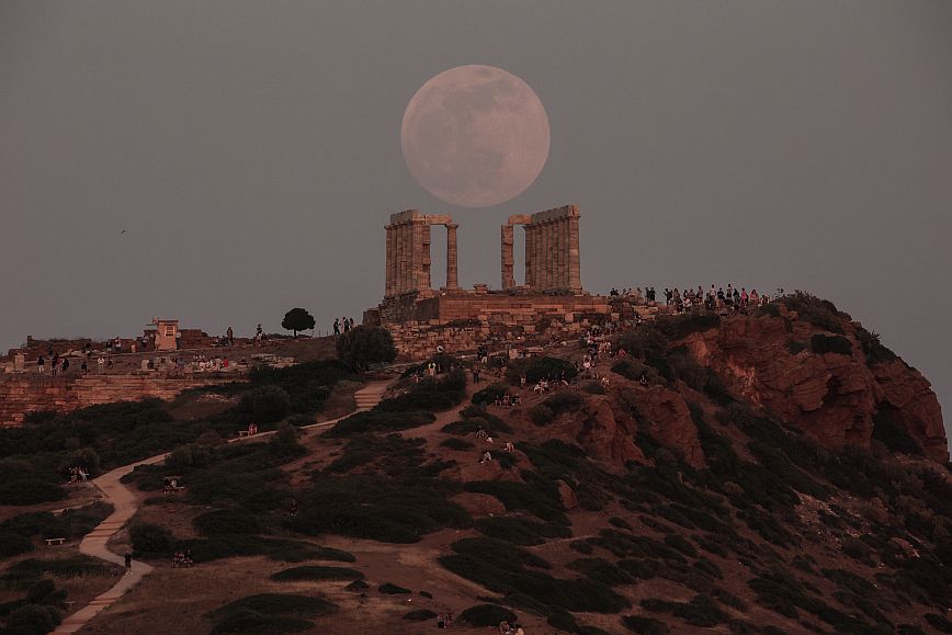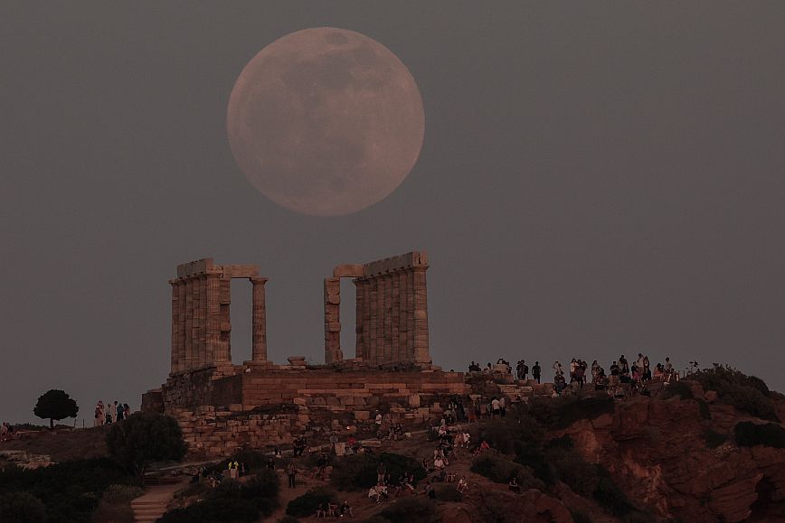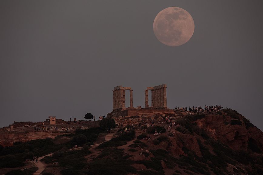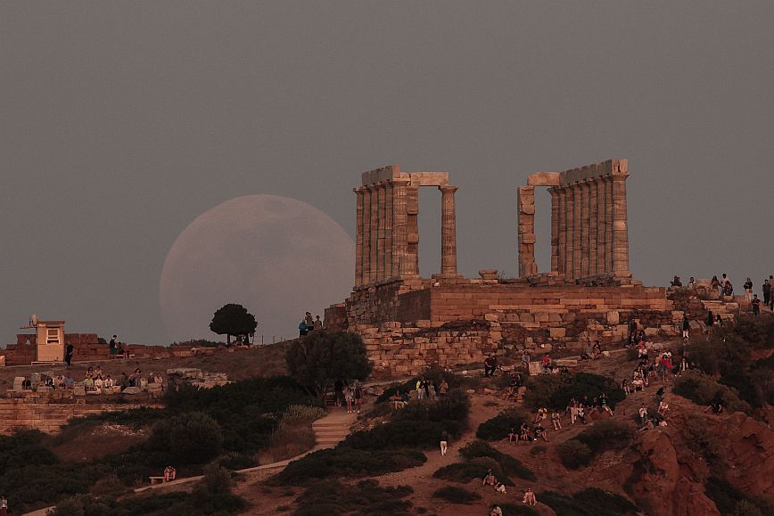 Οι πρώτες εικόνες που φτάνουν από την υπερπανσέληνο από το Σούνιο και συγκεκριμένα στον ναό του Ποσειδώνα, είναι μαγικές.