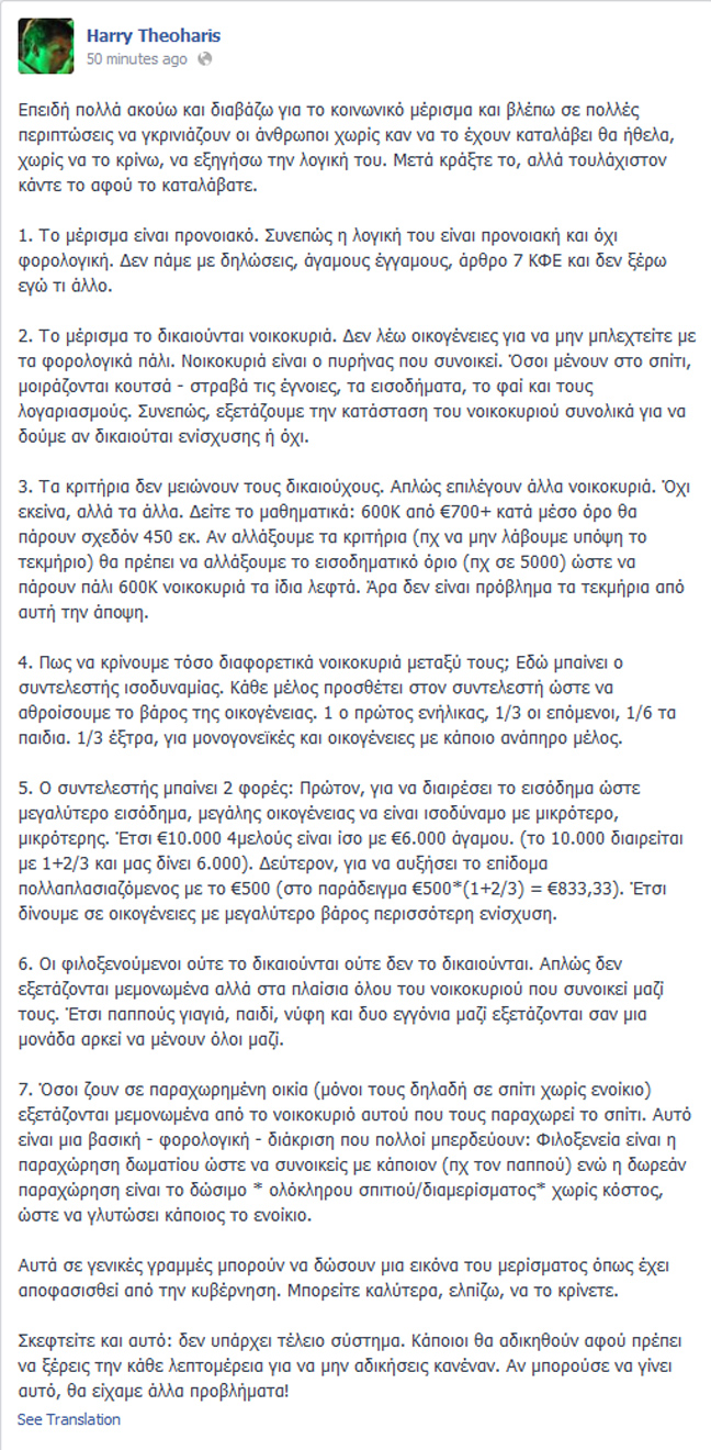 «Επειδή πολλά ακούω και διαβάζω για το κοινωνικό μέρισμα και βλέπω σε πολλές περιπτώσεις να γκρινιάζουν οι άνθρωποι χωρίς καν να το έχουν καταλάβει θα ήθελα, χωρίς να το κρίνω, να εξηγήσω την λογική του. Μετά κράξτε το, αλλά τουλάχιστον κάντε το αφού το καταλάβατε.