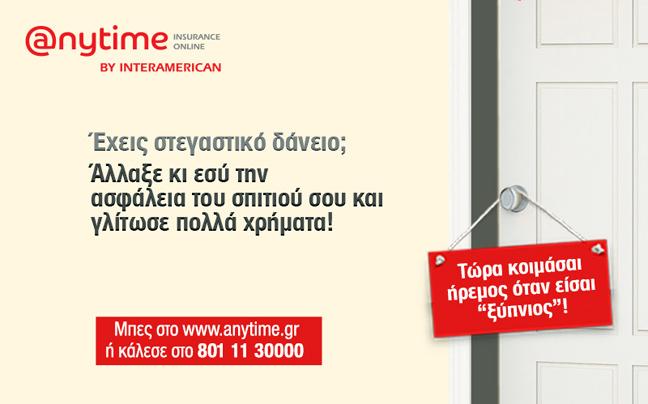 Μπες τώρα στο www.anytime.gr υπολόγισε τα ασφάλιστρά της κατοικίας σου και επίλεξε το πρόγραμμα που σου ταιριάζει.
