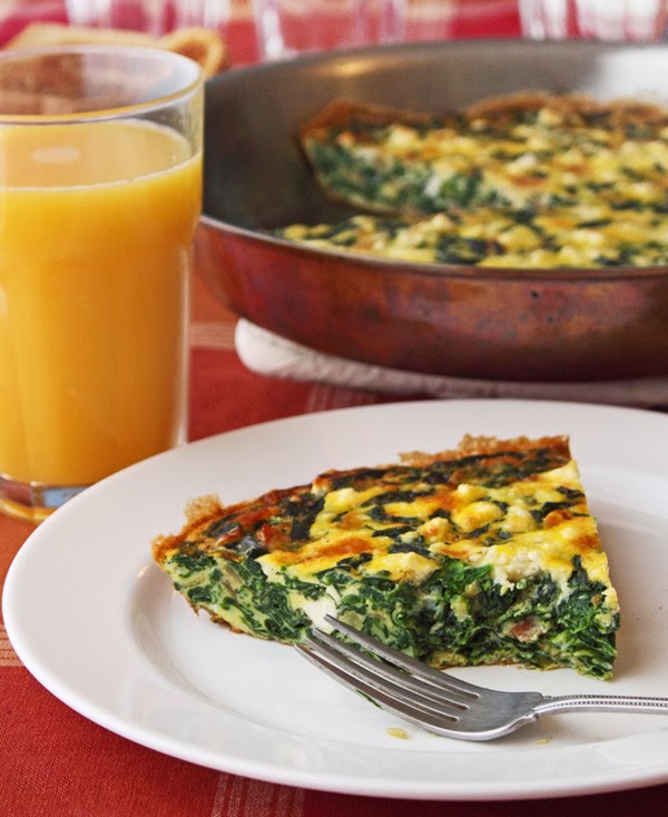 Στην συνέχεια αφαιρούμε το περιττό λάδι από το τηγάνι και ρίχνουμε το κρεμμύδι μαζί με το αλάτι. Μετά προσθέτουμε το βραστό σπανάκι ανακατεύουμε λίγο και ρίχνουμε τα αυγά. Ανακατεύουμε με μια ξύλινη κουτάλα ώστε το μείγμα να εξαπλωθεί παντού. Κλείνετε την εστία και ρίχνετε την ψιλοκομμένη φέτα. Βάζετε το μείγμα να μαγειρευτεί για 10 λεπτά στους 180 βαθμούς. Μετά τα 10 λεπτά ρυθμίζετε το γκριλ στο δυνατό και ψήνετε για 2λεπτά ίσα ίσα να κάνει μια ελαφριά κρούστα. Αφήνετε λίγο να παγώσει και σερβίρετε.