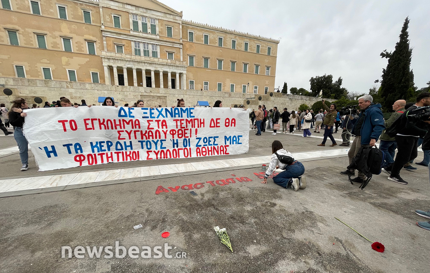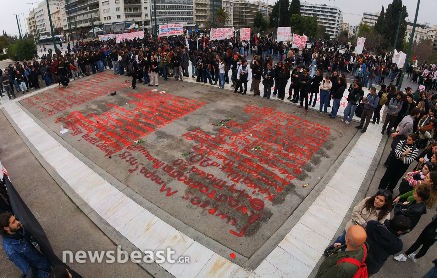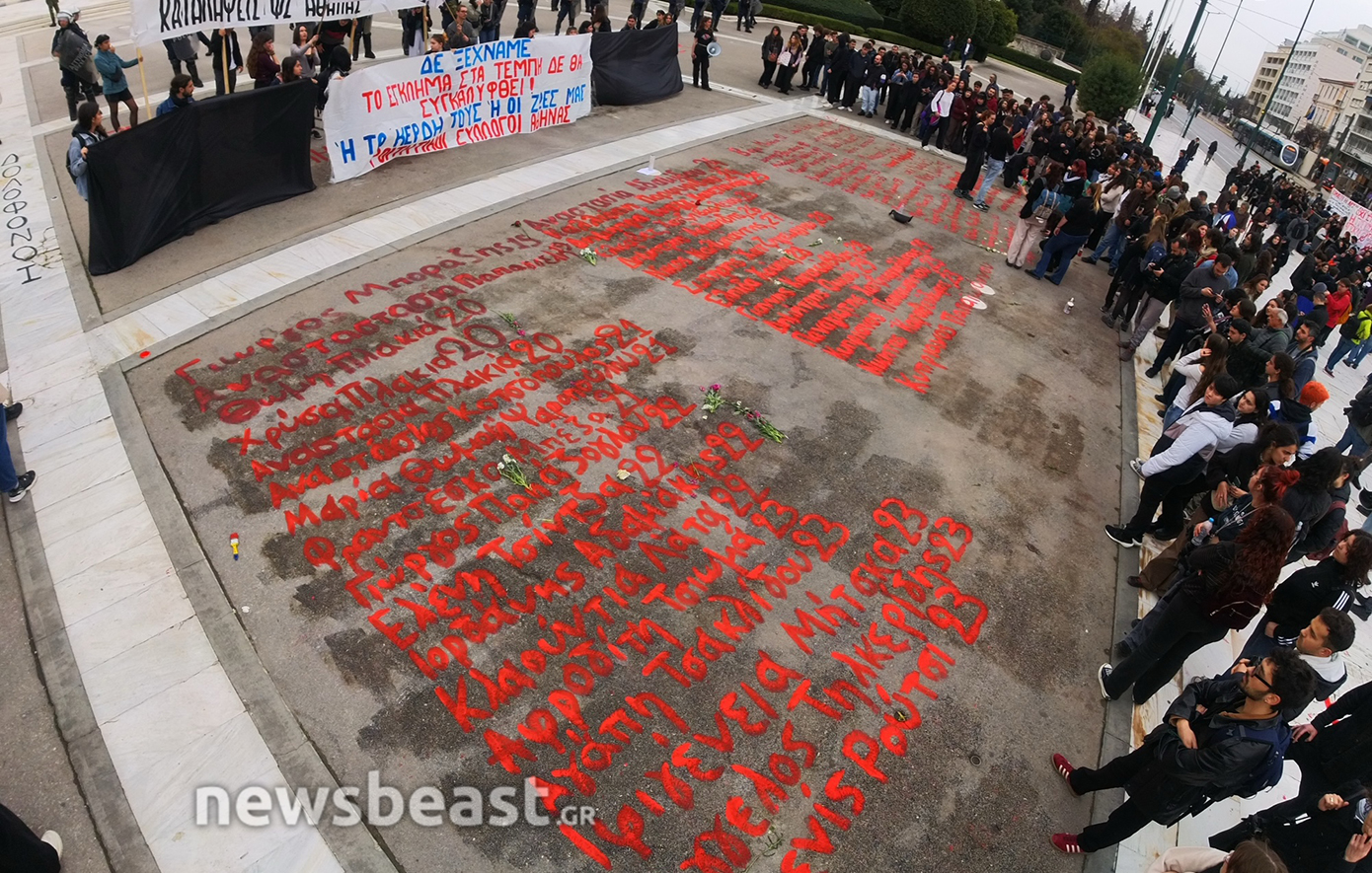 Τα ονόματα των 57 θυμάτων του δυστυχήματος των Τεμπών, που γράφτηκαν κατά τη διάρκεια της απεργιακής κινητοποίησης της Τετάρτης και σβήστηκαν από τα συνεργεία του Δήμου το βράδυ της ίδιας μέρας, προκαλώντας αναστάτωση και επικρίσεις, ξαναγράφονται από φοιτητές που πραγματοποιούν διαδήλωση ενάντια στα ιδιωτικά πανεπιστήμια.