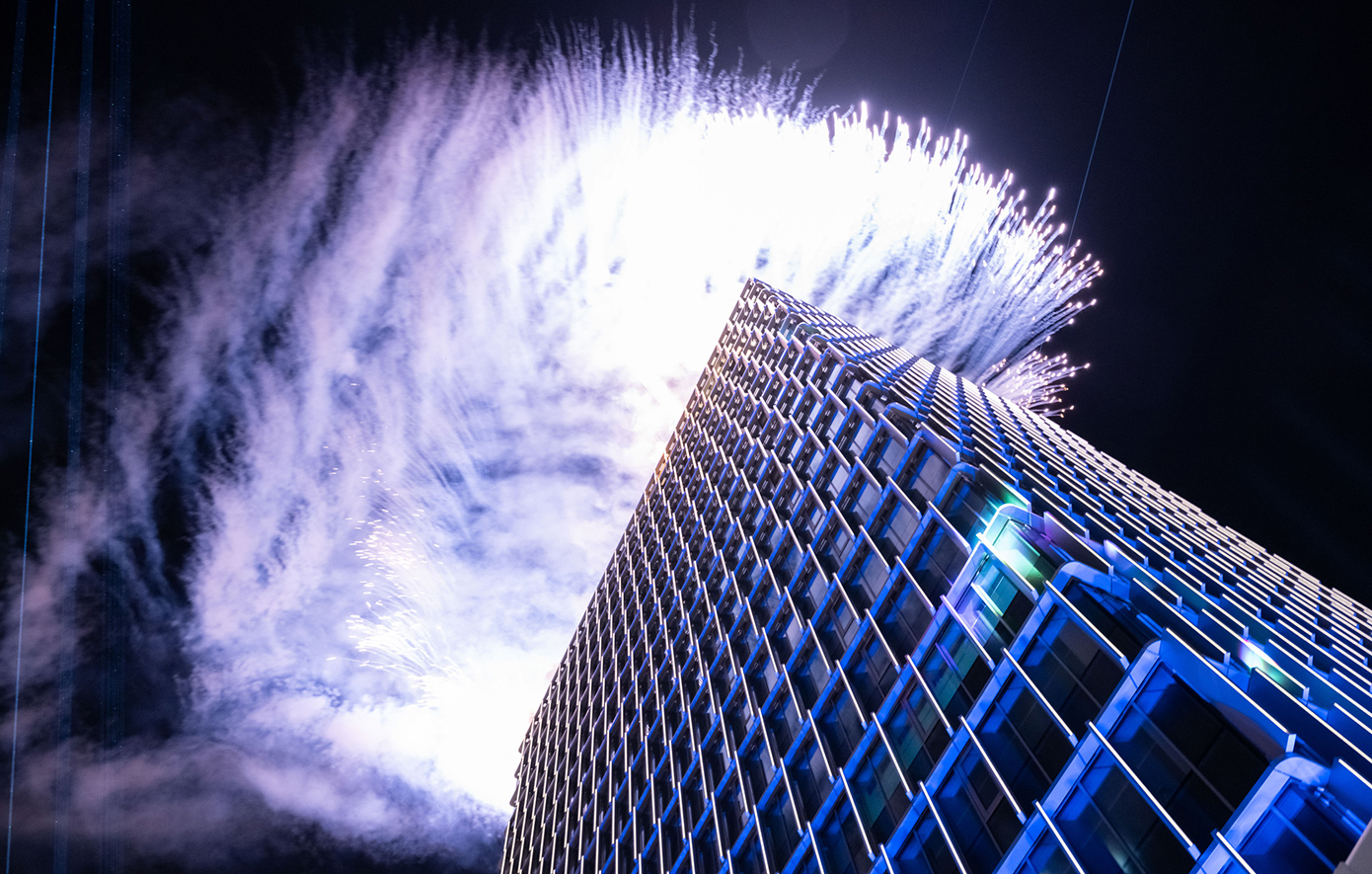 Η «Φιλαρμόνια Ορχήστρα Αθηνών», που αποτελείτο από 30 μουσικούς, υπό τη διεύθυνση του Νικόλαου Μαλιάρα, εκτέλεσε το μουσικό έργο “Βαλς της Πευκοβελόνας” του συνθέτη Αλέξανδρου Δράκου Κτιστάκη, το οποίο δημιουργήθηκε ειδικά για τη βραδιά αυτή. Ταυτόχρονα, 360 drones πέταξαν πάνω από το λιμάνι του Πειραιά σχηματίζοντας σμήνη από γλάρους και κύματα της θάλασσας, καταλήγοντας στον σχηματισμό του λογοτύπου της Piraeus Tower. Εν συνεχεία, εστίες από laser και φωτιστικές κεφαλές, συνέδεσαν τον Πύργο με διάφορα σημεία του λιμανιού, την ίδια στιγμή που 600 πυροτεχνήματα τοποθετημένα στην οροφή του κτηρίου, χρωμάτισαν τον ουρανό, προσφέροντας ένα μοναδικό υπερθέαμα.