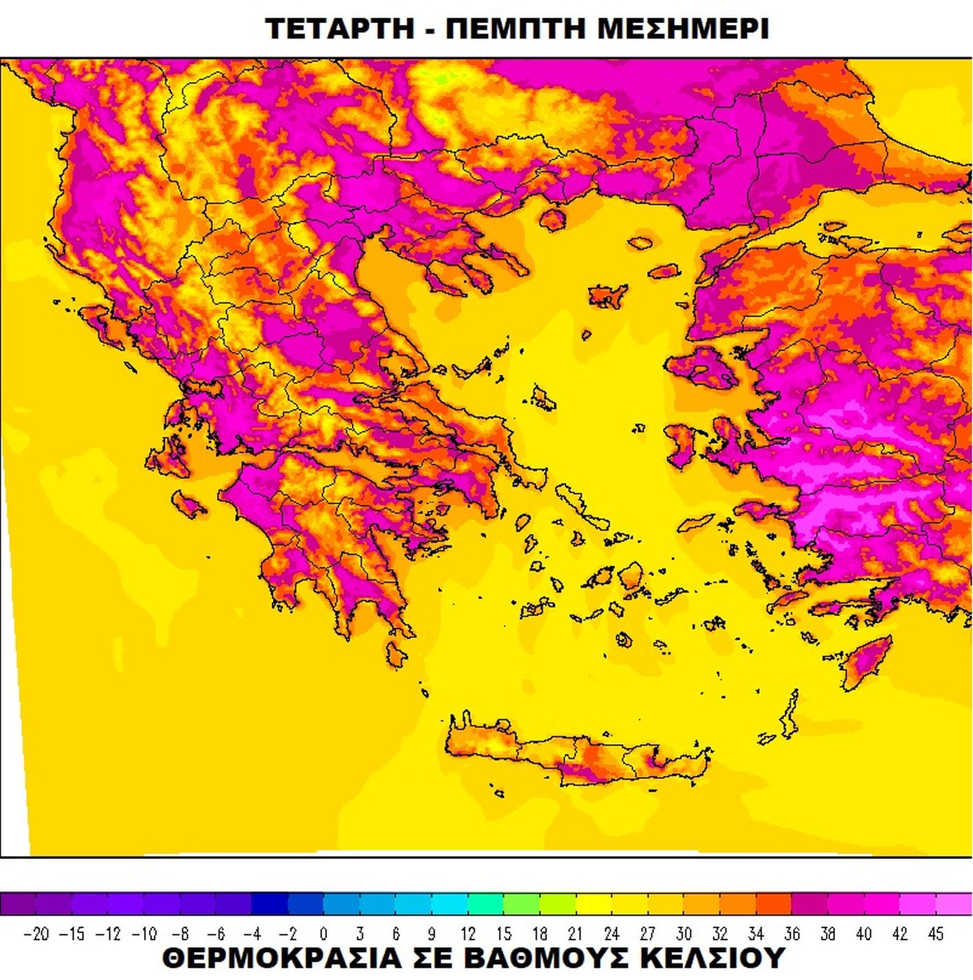 Σε κλοιό έντονης και παρατεταμένης ζέστης βρίσκεται η χώρα μας, κάτι που θα συνεχιστεί και τις επόμενες ημέρες με την κορύφωση αυτού του ισχυρού θερμού κύματος να εντοπίζεται το διήμερο Τετάρτη – Πέμπτη όπου ο υδράργυρος θα αγγίξει τοπικά τους 42° με 43° σε κλειστές και μακριά από τη θάλασσα περιοχές.