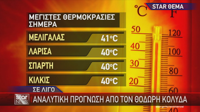 Οι μέγιστες θερμοκρασίες σήμερα σημειώθηκαν, σύμφωνα με το Star στον Μελιγαλά Μεσσηνίας, όπου έφθασε τους 41 βαθμούς. Σε Λάρισα, Σπάρτη, Κιλκίς, Λαγκαδά, Κατερίνη και Άργος η θερμοκρασία έφθασε τους 40 βαθμούς Κελσίου.