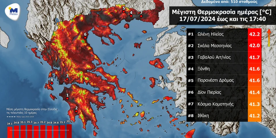Η υψηλότερη θερμοκρασία για την Τετάρτη 17/7 καταγράφηκε στην Ωλένη Ηλείας (42.2 °C) και ακολούθησε η Σκάλα Μεσσηνίας (42.0 °C) και η Γαβαλού Αιτωλοακαρνανίας (41.7 °C), με τον καύσωνα να συνεχίζει απτόητος να ταλαιπωρεί τους πολίτες.