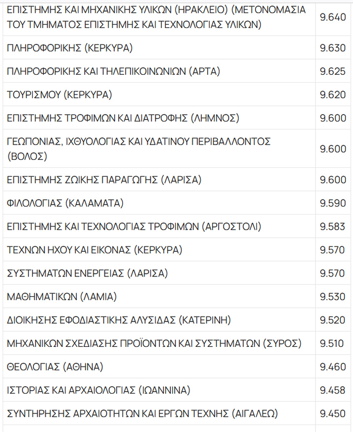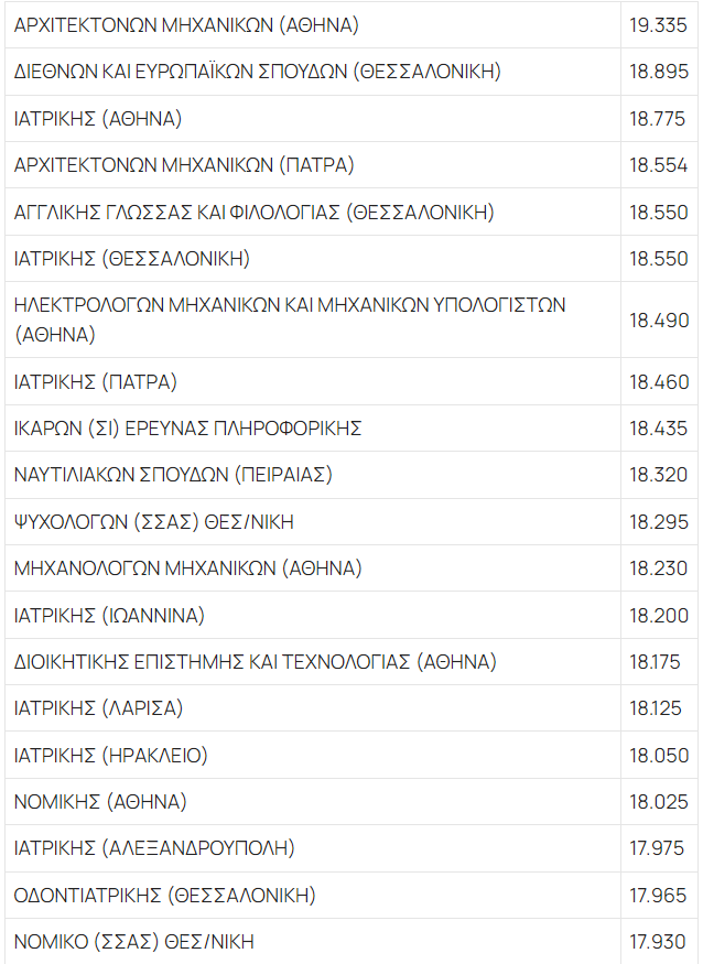 Συγκεκριμένα, σύμφωνα με την ΕΡΤ, οι 20 σχολές με τα υψηλότερα μόρια είναι οι εξής: