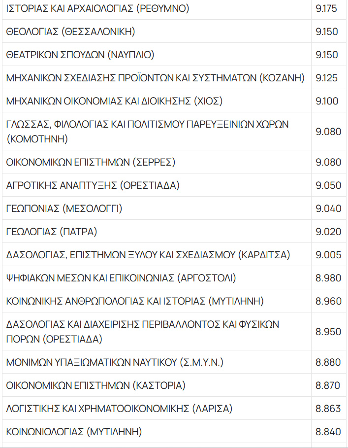 Ακολουθούν οι σχολές με τα υψηλότερα μόρια και αυτές που συγκέντρωσαν κάτω από 10.000 μόρια.